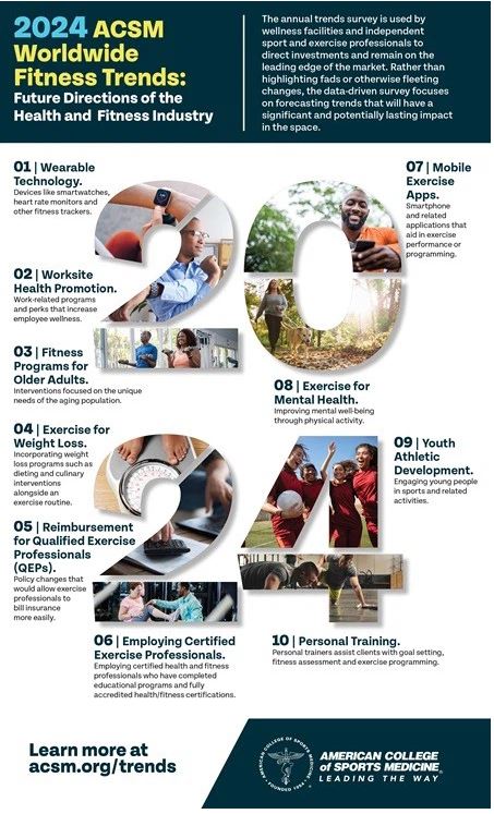 (Indianapolis, IN) – The American College of Sports Medicine (ACSM) released survey results today in the article “2024 ACSM Worldwide Fitness Trends: Future Directions of the Health and Fitness Industry,” published in the January/February issue of ACSM’s Health & Fitness Journal®. Since 2006, the ACSM Worldwide Fitness Trends survey has gathered input from 2,000 clinicians, researchers and practitioners in the fitness industry and is designed to provide input on fitness trends as opposed to “fads” that have little or no impact on the industry.