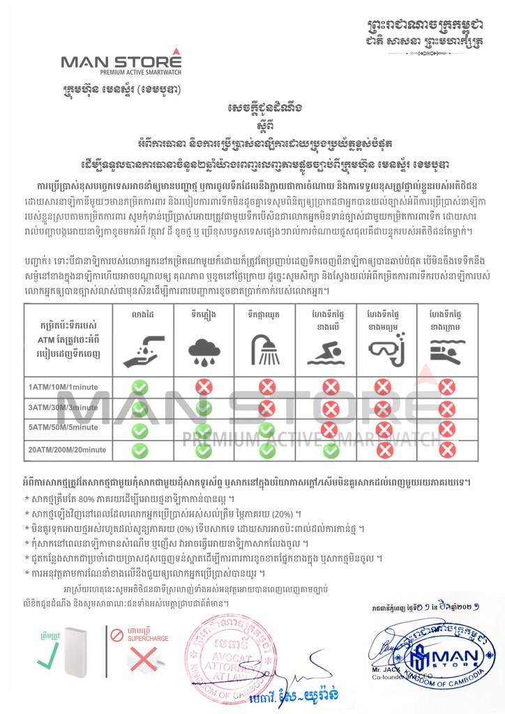 - ការខូចខាតដោយខ្លួនឯង ការប្រើខុសបច្ចេកទេស ការពាក់ត្រូវទឹក សាកថ្មខុសបច្ចេកទេសដោយគ្មានលិខិតបញ្ជាក់អំពីការសិក្សានៃវគ្គប្រើប្រាស់នាទិ្បកាដែលចេញដោយក្រុមហ៊ុន MS និងមិនធានាទៅលើបញ្ហា បាក់បែក ឬ ខួចទ្រង់ទ្រាយដើមផលិតផលការរលុបលេខសំគាល់ ការខួចខាតដោយសារការប្រើប្រាស់ ការធ្លាក់រហែក ការឆេះប៉ះទង្គិច ឬការឆេះដែលបណ្តោលមកពី ដី សត្វ ឬសត្វល្អិតចូល និងមិនបានចុះប័ណ្ណធានានោះលោកអ្នកនឹងមិនទទួលបានការធានានោះទេ ។